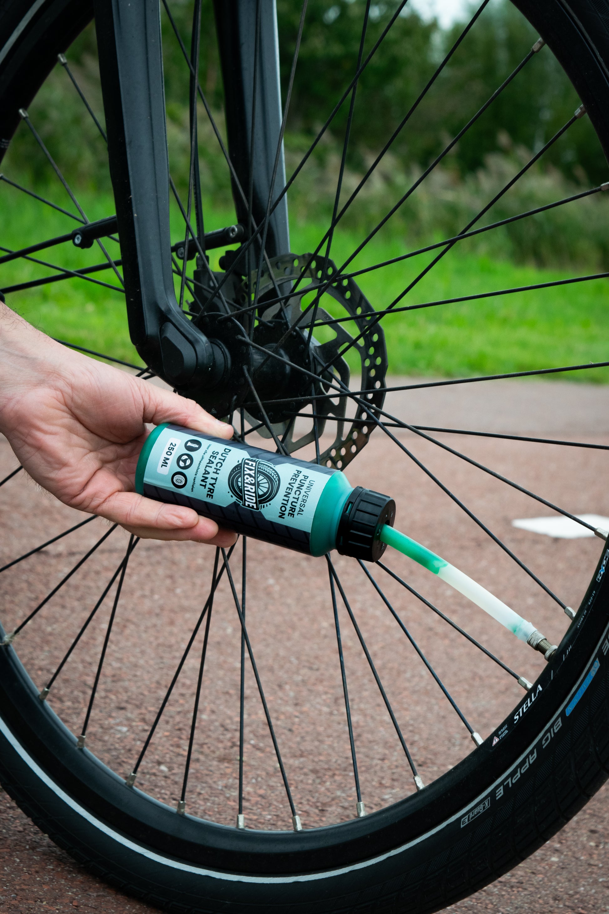 Met Fix & Ride is het aanbrengen van de vloeistof eenvoudiger dan ooit. Je hoeft alleen de dop te openen en de vloeistof via het ventiel in de band te gieten. Binnen enkele seconden is je band volledig beschermd tegen lekken en luchtverlies. Geen ingewikkelde handelingen, geen speciaal gereedschap – gewoon een snelle en betrouwbare oplossing waarmee je direct zorgeloos verder kunt fietsen.